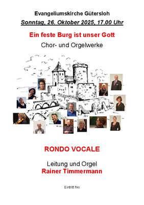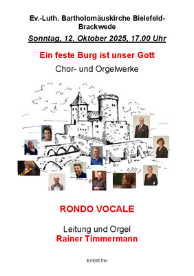 Der Chor Rondo Vocale präsentiert dann sein neues Programm unter dem Motto „Martin Luther“. Hintergrund ist eine Einladung aus Barcelona von der deutschsprachigen Evangelischen Gemeinde. In der dortigen „Martin-Lutherkirche“, in der auch eine große Orgel der Firma Kleuker aus Brackwede steht, wird der Chor am Freitag, 31. Oktober, ein Konzert zum Reformationsfest geben. Vertonungen des Chorals „Ein feste Burg ist unser Gott“ für Chor und Gemeindegesang sowie auch Chorsätze von Martin Luther stehen auf dem Programm. Die Leitung hat Rainer Timmermann, der u.a. auch die Orgelsonate „Ein feste Burg“ von Wilhelm Rudnick spielen wird. Der Eintritt ist wie immer frei. (rt)