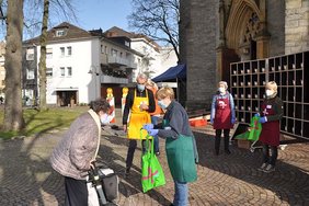 Die Mitarbeitenden verteilten die Suppen mit Tragetasche und Grußkarte an die vielen Gäste. Mit einer freundlichen Begrüßung und e offenem Ohr verteilten die Mitarbeitenden nicht nur Suppe, sondern auch die Botschaft von Zuwendung und Nähe. Foto: CG